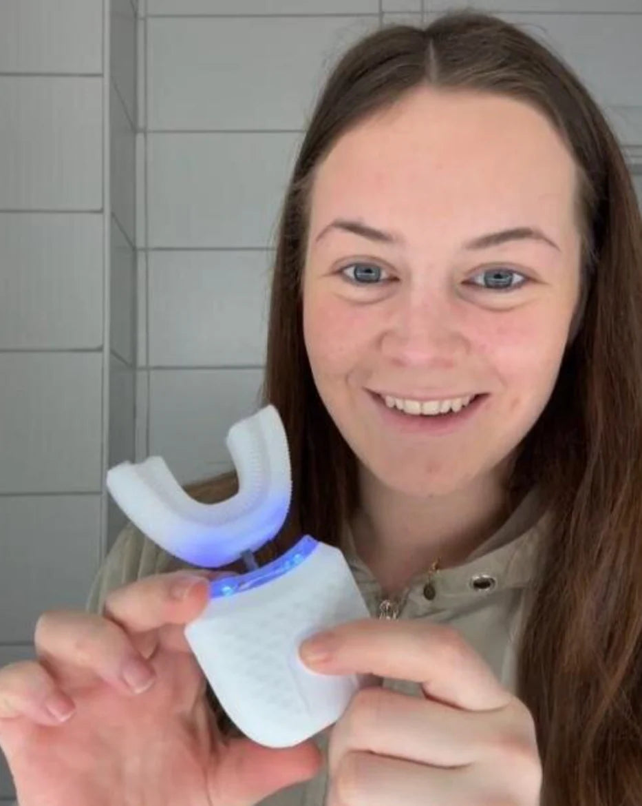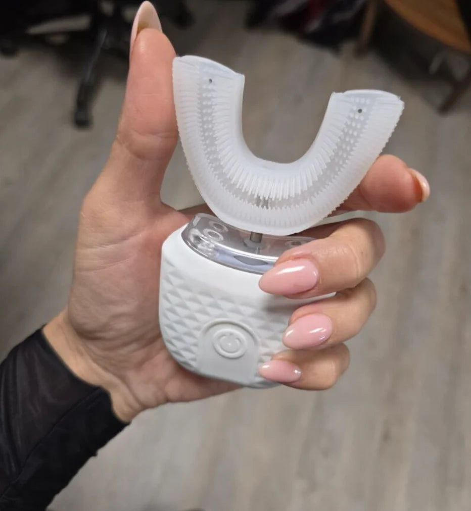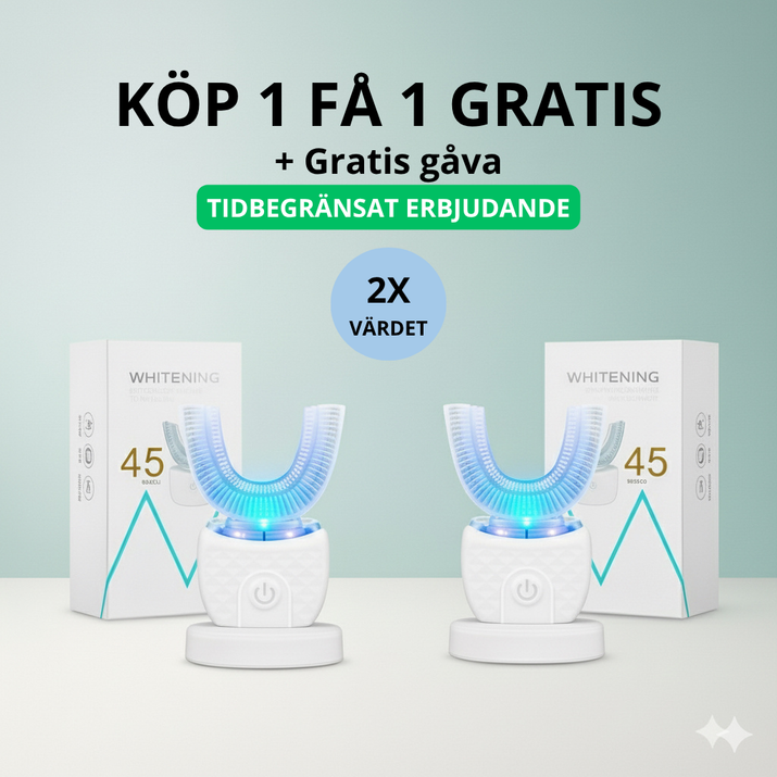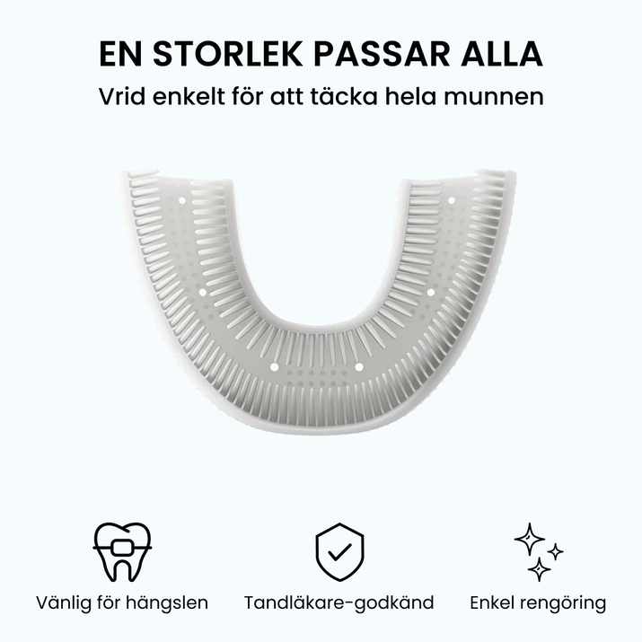 Svar 1: Den unika U-formade designen av tandborsten omger alla tandytor samtidigt för att ge en grundlig och effektiv borstning, vilket sparar tid och säkerställer att alla områden rengörs noggrant.